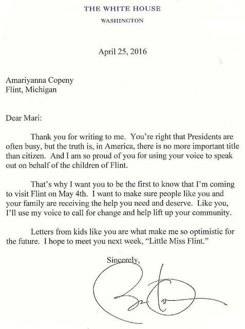 There are big important things happening with Republicans today. For example, a former House Speaker was sentenced to jail time, a presidential candidate gave an incoherent speech about foreign policy and another one is about to announce a VP pick who is even less popular than he is. But seriously, doing anything more than simply note those things in passing is a sure-fire way to spread depression and cynicism. Instead, I thought you might like to know that last month an 8 year old girl in Flint, Michigan wrote President Obama a letter. Mr. President, Hello my name is Mari Copeny and I’m 8 years old, I live in Flint, Michigan and I’m more commonly known around town as “Little Miss Flint”. I am one of the children that is effected by this water, and I’ve been doing my best to march in protest and to speak out for all the kids that live here in Flint. This Thursday I will be riding a bus to Washington, D.C. to watch the congressional hearings of our Governor Rick Snyder. I know this is probably an odd request but I would love for a chance to meet you or your wife. My mom said chances are you will be too busy with more important things, but there is a lot of people coming on these buses and even just a meeting from you or your wife would really lift people’s spirits. Thank you for all that do for our country. I look forward to being able to come to Washington and to be able to see Gov. Snyder in person and to be able to be in the city where you live. Thank You She got a response.