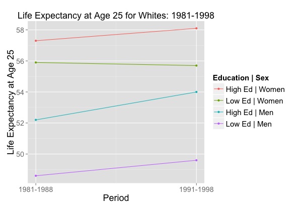 Similarly, Olshanky and his colleagues found a sharp decline in life expectancy among white women with less than a high school education: